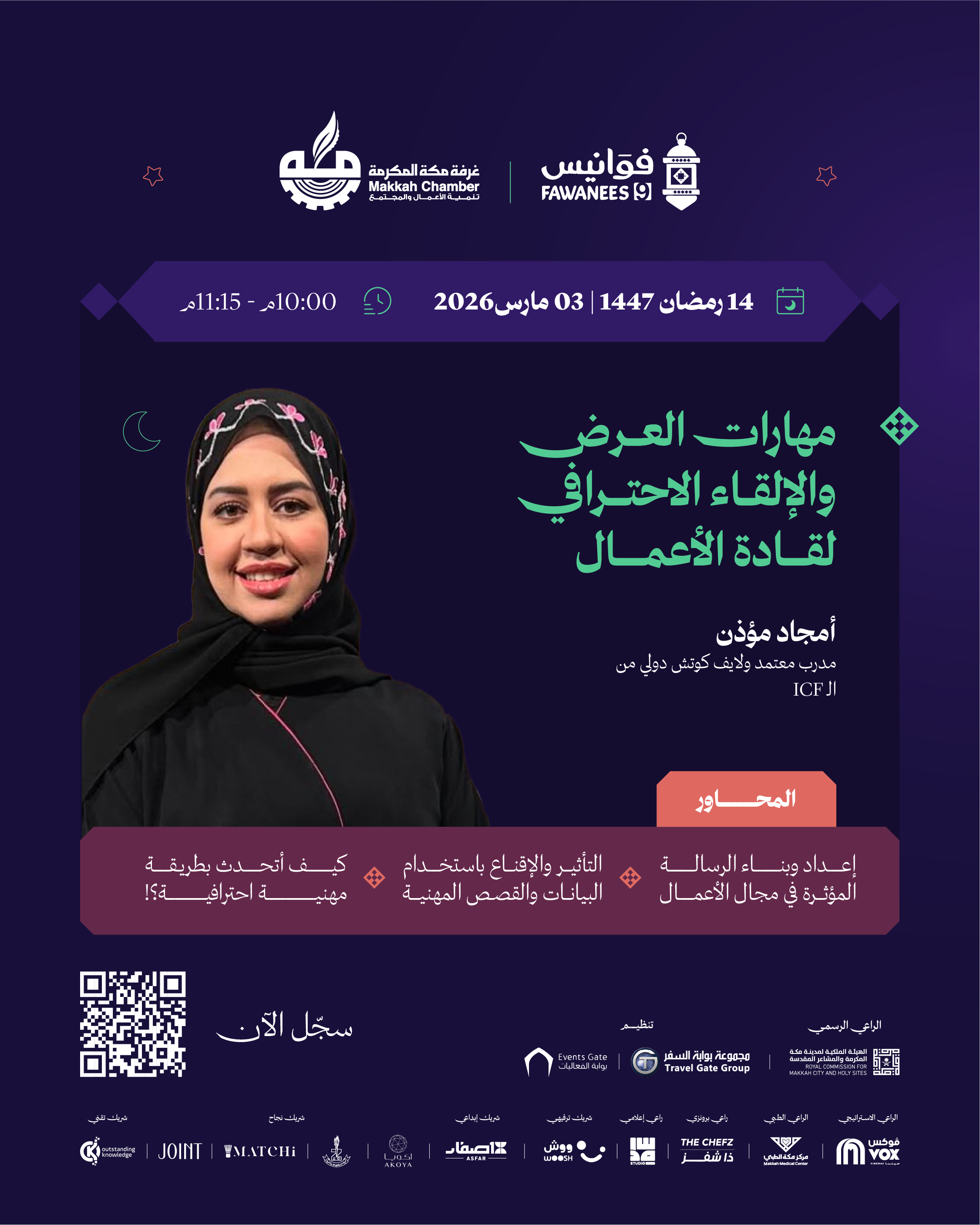 نوع التذكرة: مهارات العرض والإلقاء الاحترافي لقادة الأعمال