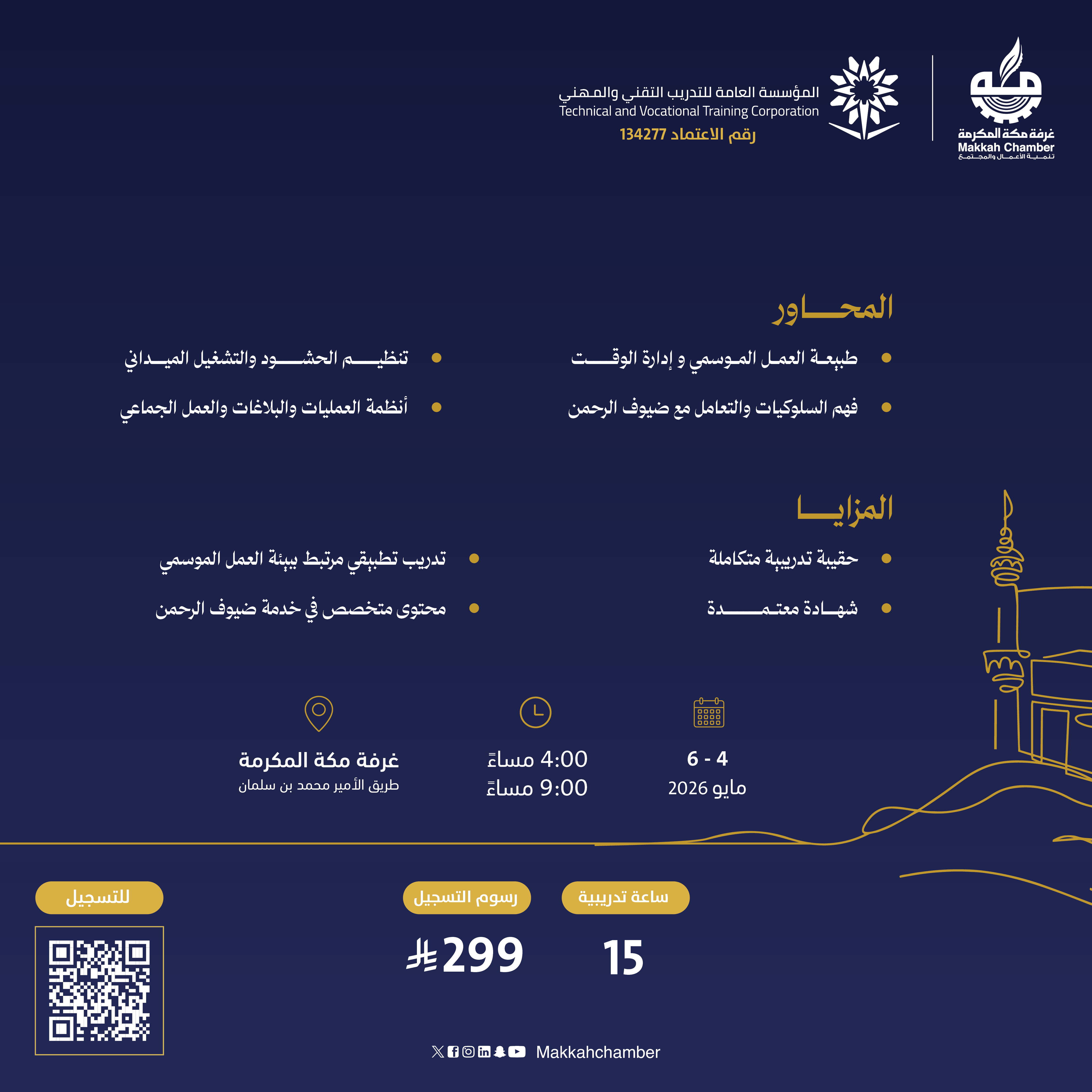 1/ طبيعة العمل الموسمي وبيئة التشغيل. 2/ إدارة الوقت وضغط العمل. 3/ فهم السلوكيات والتعامل مع الأفراد موظفين ضيوف الرحمن. 4/ تنظيم الحشود والتشغيل الميداني. 5/ أنظمة العمليات والبلاغات والعمل الجماعي.